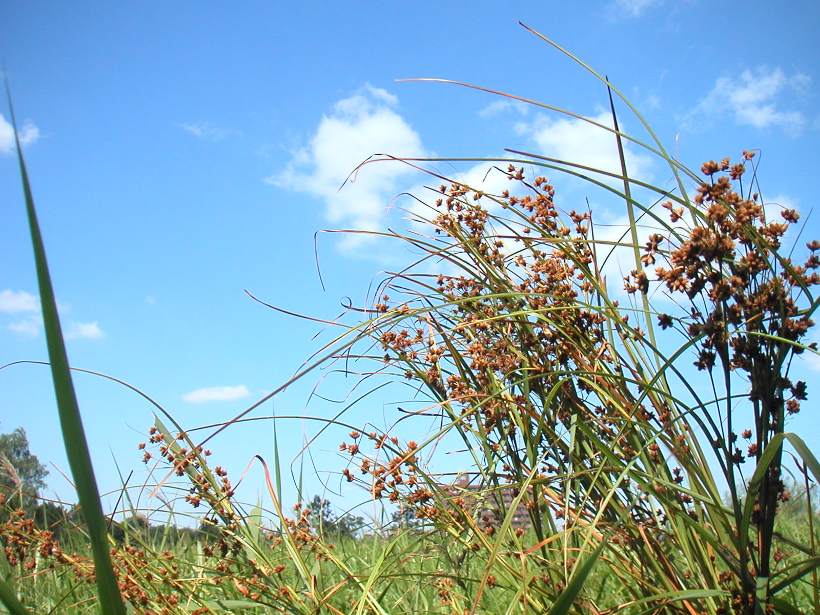 抜けるような青空、確かにマツボックリを連想させるマツカサススキ(カヤツリグサ科)
