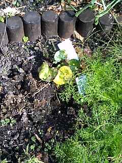 西日暮里2丁目北児童公園の街なか花壇の苗が盗まれた。斑入りのツワブキの苗3株のうち2株がなくなっていた。写真の土のへこんだ黒い部分に苗があったはず・・・。