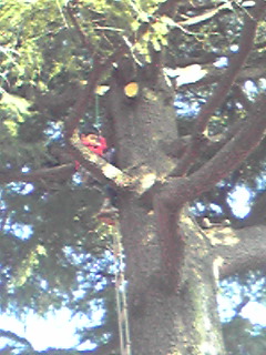 赤シャツのボクは、ヒマラヤスギの下からは見えないくらいのところまで登ってしまった。私ももう少し若ければ挑戦したいのだけれど・・・。